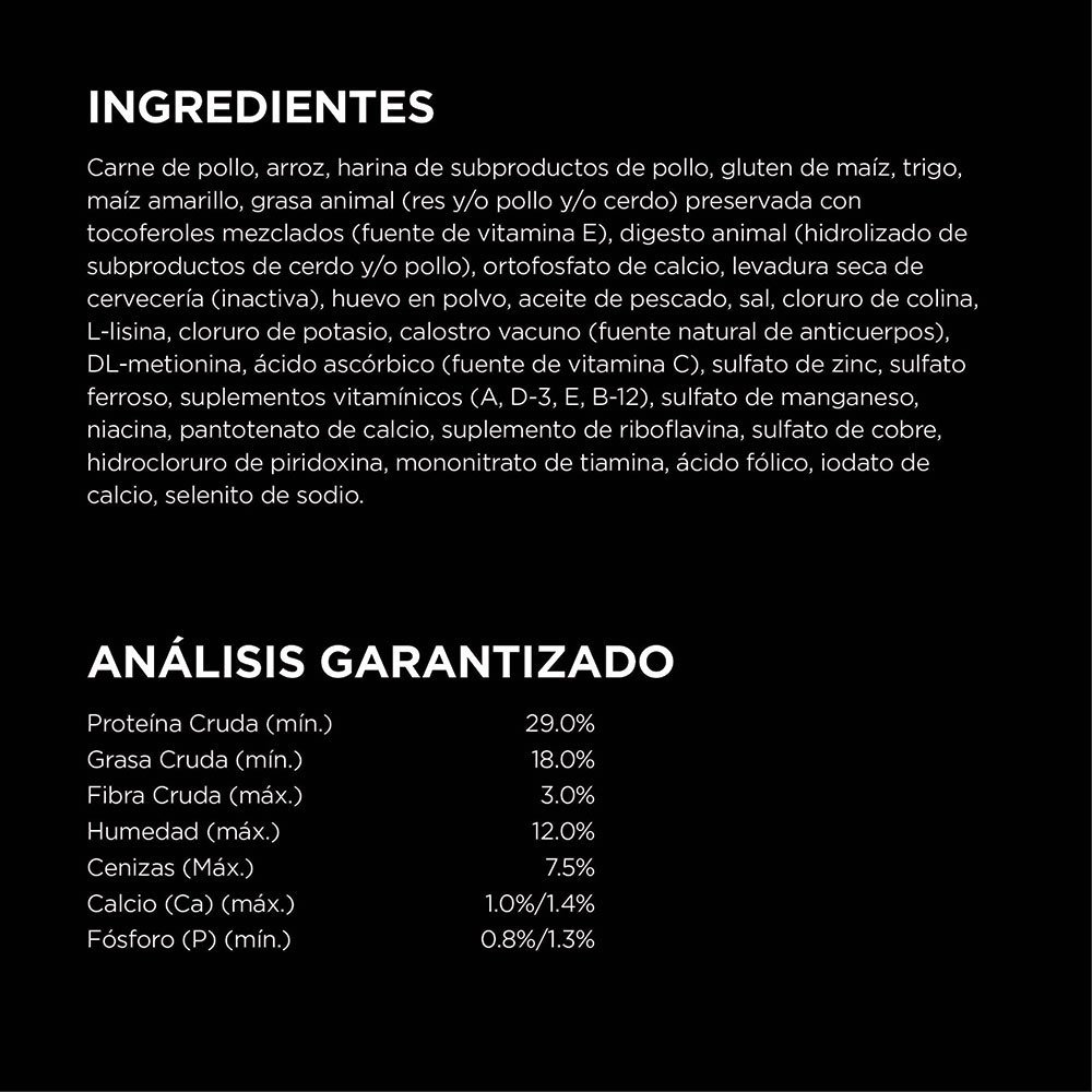 - Una exclusiva combinación de ingredientes, que incluye micro-nutrientes, factores de crecimiento del calostro y minerales esenciales que ayuda a estimular el crecimento apropiado y el desarrollo de los huesos de los cachorros, para que crezcan saludables.